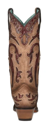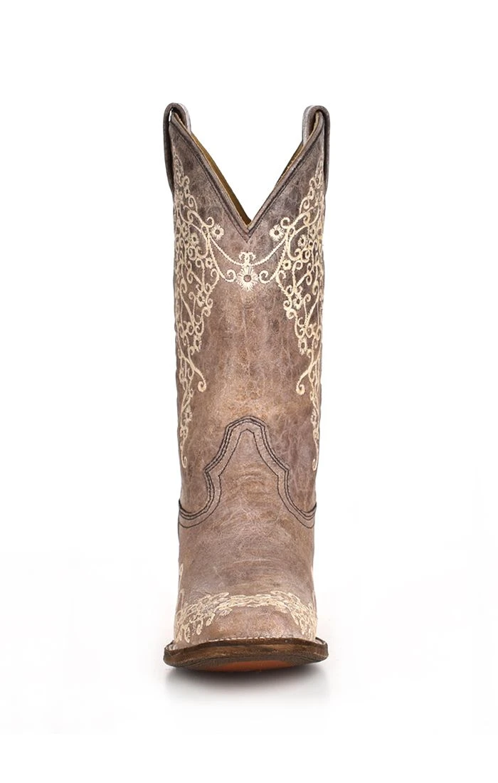 Brown Crater Square Toe Western Boot with Bone Floral Embroidery.