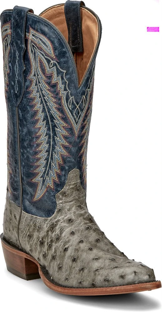Grey Full Quill Ostrich Rudy Boot with Distressed Denim Blue Goat Leather Upper.