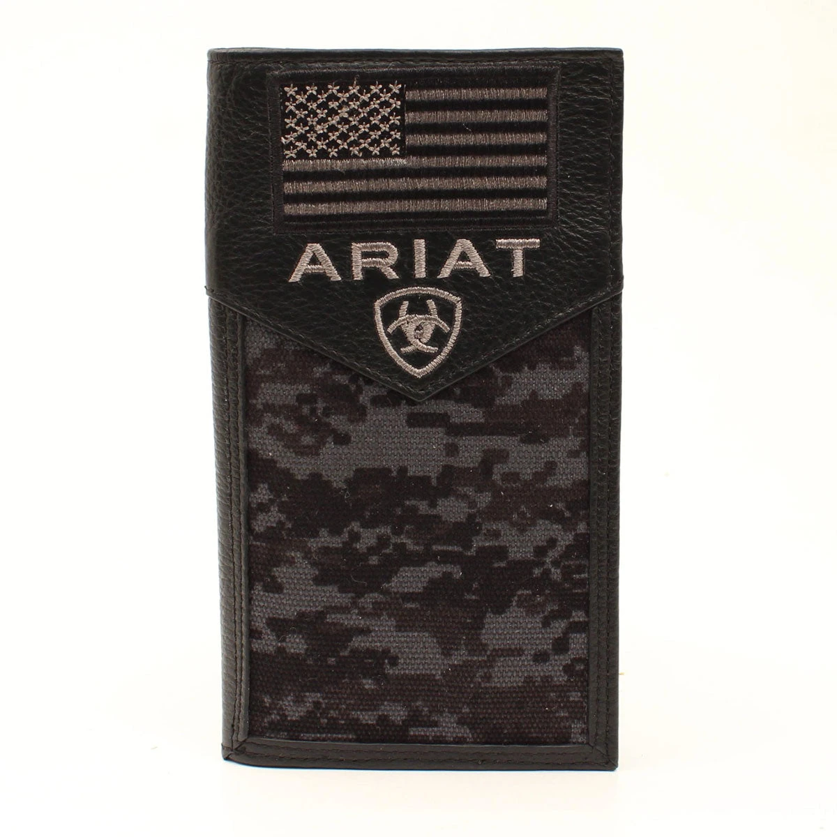 Black Leather and Black Digital Camo Rodeo Wallet with USA Flag Patch.