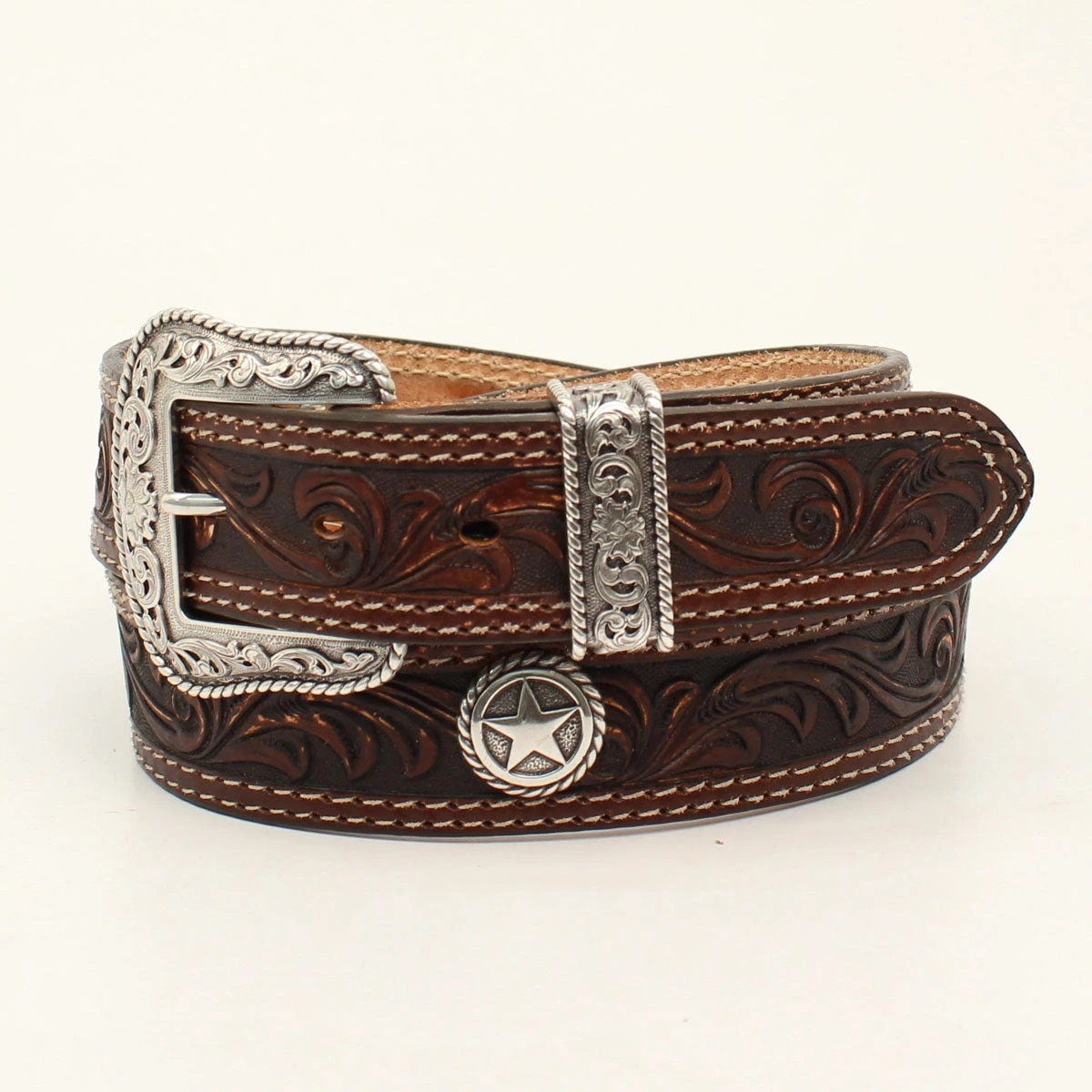 Brown Hand Sanded Vintage Floral Embossed San Antonia Western Belt with Decorative Contrasting Double Stitched Edge and Antique Silver Round Western Star Conchos.