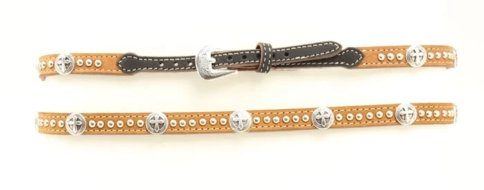 Brown and Black Leather Hatband with Round Silver Cross Conchos and Studs.