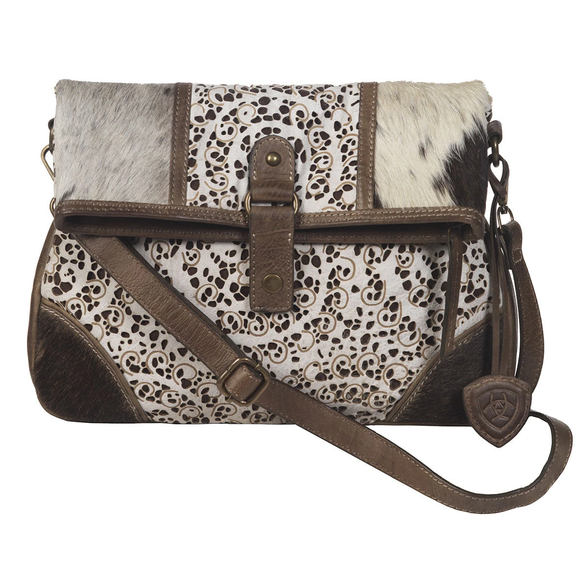 Medium Brown, Genuine Leather Calf Hair and Pierced Ivory Leather Phoenix Crossbody Purse.