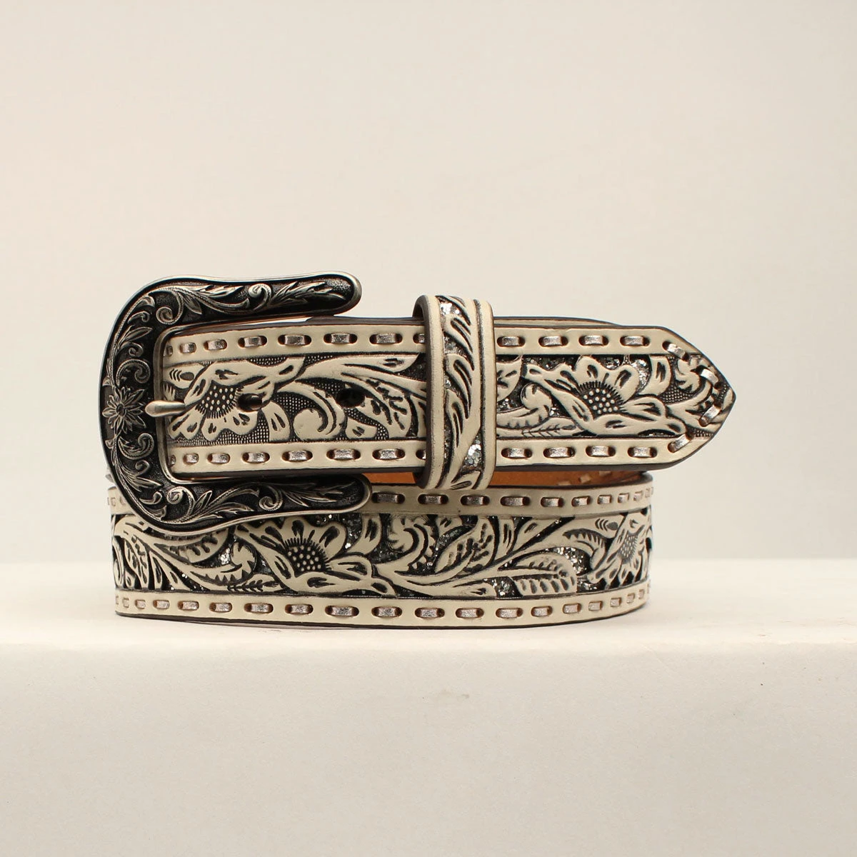 White Floral Embossed and Pierced Western Belt with Silver Glitter Underlay.