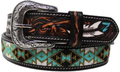 Western Antique Floral Tooled Beaded Full-Grain Leather Western Belt.