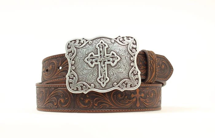 Brown Tooled Western Belt with Cross Buckle.