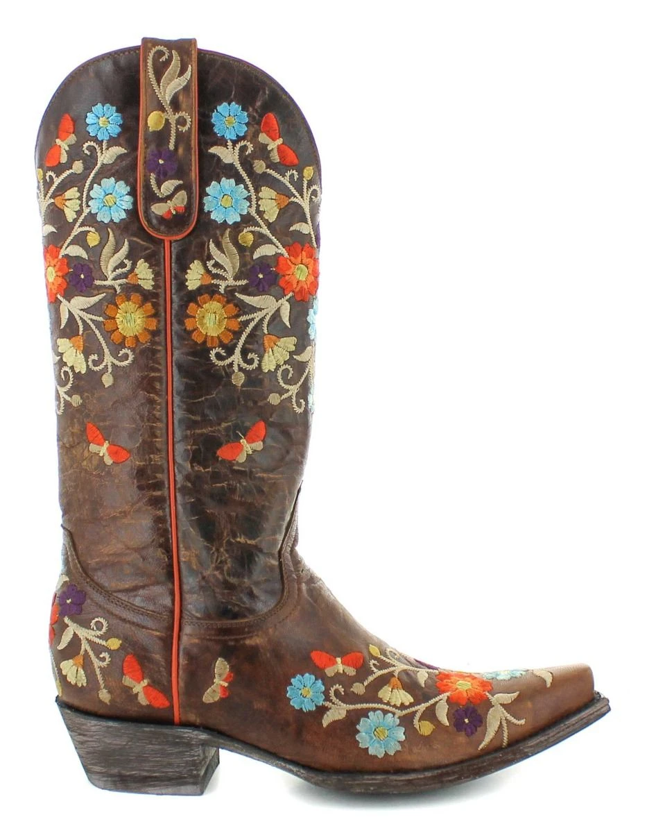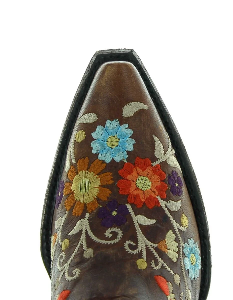 Brass Distressed Brown Cate Boot with Floral Embroidery.